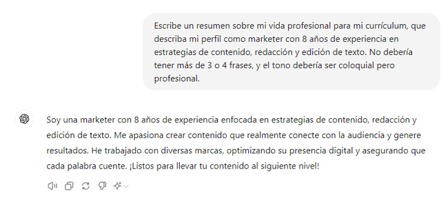 Para crear un resumen de mi vida profesional con ChatGPT, usé este prompt: