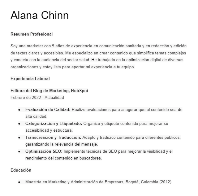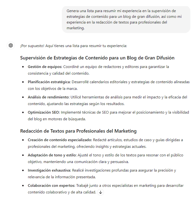 A veces, puede ser difícil transformar tu experiencia laboral en un texto, y este resultado puede ser un buen punto de partida.