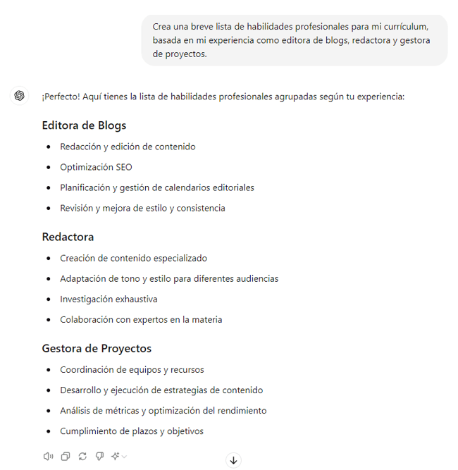 - A partir del primer resultado: Adapta estas habilidades según la descripción de esta oferta de empleo. [Copia y pega la descripción de la oferta].