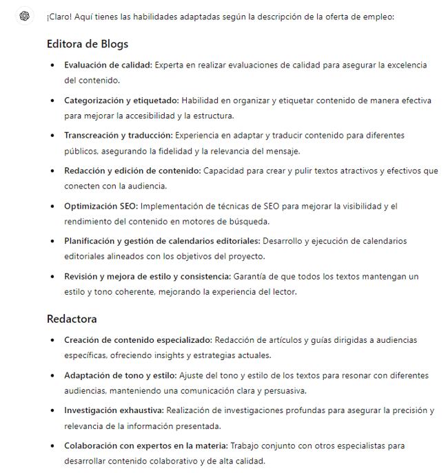No está mal, pero quiero asegurarme de que estas habilidades son relevantes para la oferta laboral a la que voy a enviar mi currículum. Para ello, utilicé este segundo prompt: