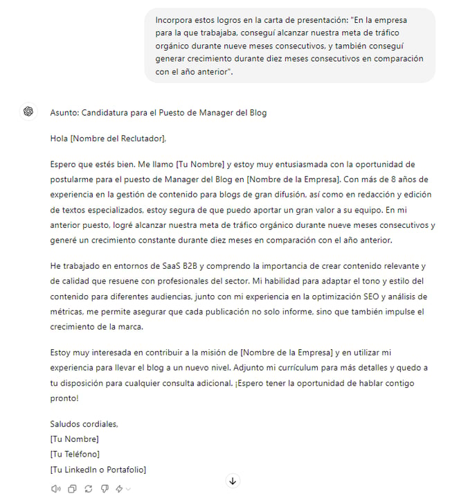 A continuación, le pedí a ChatGPT que incorporara un par de mis logros personales en la carta.