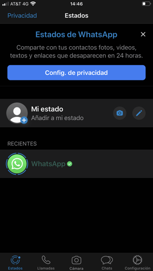 Usa la función de estado de WhatsApp para publicar actualizaciones que desaparecen después de 24 horas. La aplicación imita las historias de Snapchat o Instagram de forma exitosa, pues 500 millones de personas usan el estado de WhatsApp a diario. ¡No te quedes atrás!