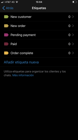 Por ejemplo, si estás utilizando WhatsApp Business para vender un producto puedes incluir etiquetas como «nuevo pedido», «pago recibido», «pago pendiente», «pedido completado», etc. Así, será sencillo encontrar tus chats por tema.