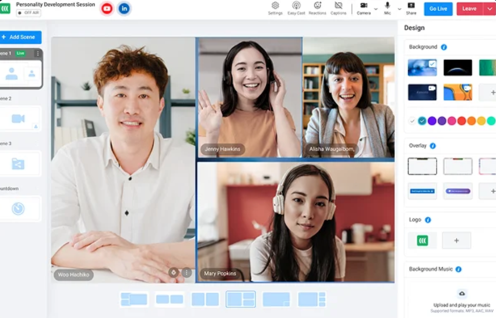 Una transmisión de este tipo se realiza a través de un software especializado en transmitir video en una red multipunto, donde varios usuarios interactúan al mismo tiempo. Entre las características más destacables de esta se encuentran: