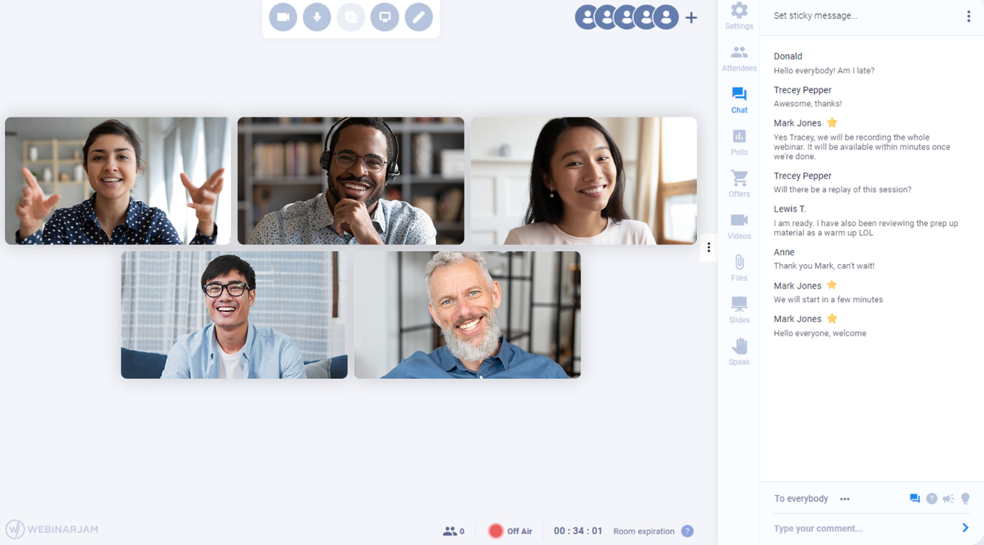 Cuando inicia el seminario web, los panelistas son los encargados de dirigir la reunión, además les es posible compartir la pantalla de su ordenador para mostrar alguna presentación o contenido multimedia. Se puede habilitar un chat dentro de la sesión para que todos los participantes den opiniones, presenten dudas o hagan preguntas acerca del tema tratado en la videoconferencia.