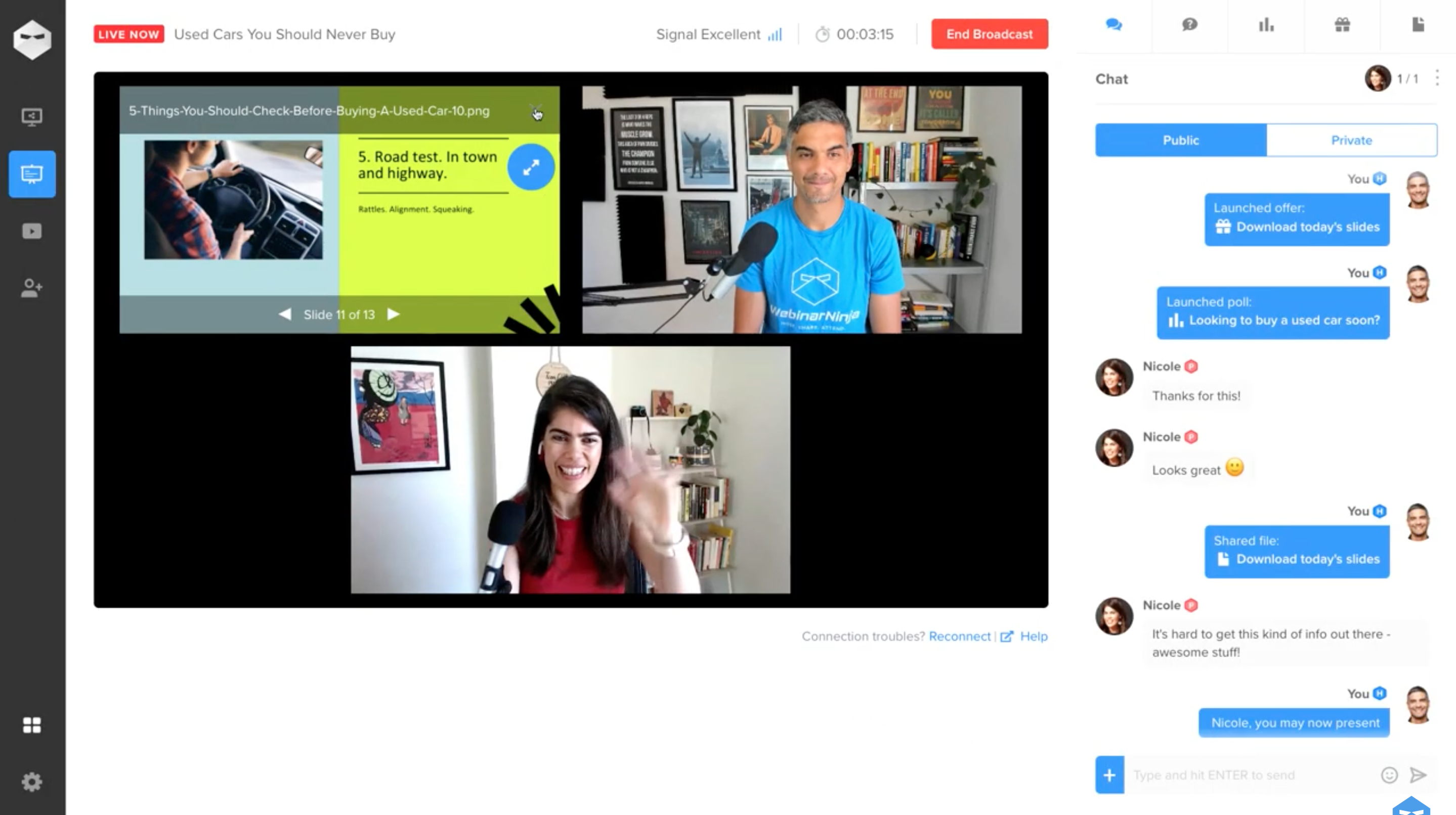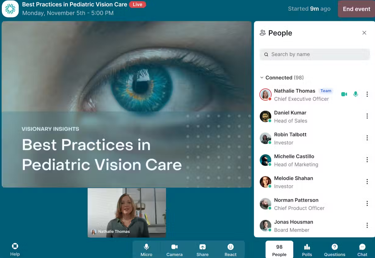 Ya sea con un miembro de tu equipo o un líder externo, este formato de webinar te permite crear un chat casual con tu público objetivo. De esta manera, los miembros de la audiencia pueden sintonizar, sentarse y disfrutar de una conversación natural haciendo preguntas y generando nuevas direcciones durante una discusión.