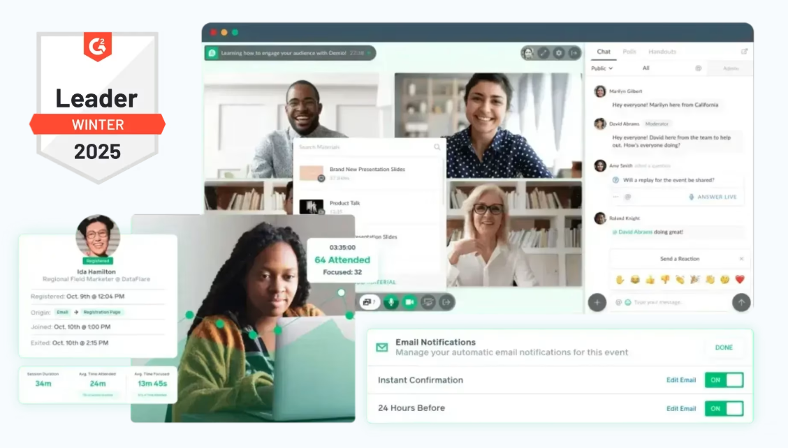 BigMarker se especializa en eventos virtuales de gran escala y experiencias inmersivas que rivalizan con eventos presenciales. Su capacidad para manejar audiencias masivas y múltiples presentadores simultáneos la convierte en la opción preferida para conferencias virtuales y cumbres empresariales.