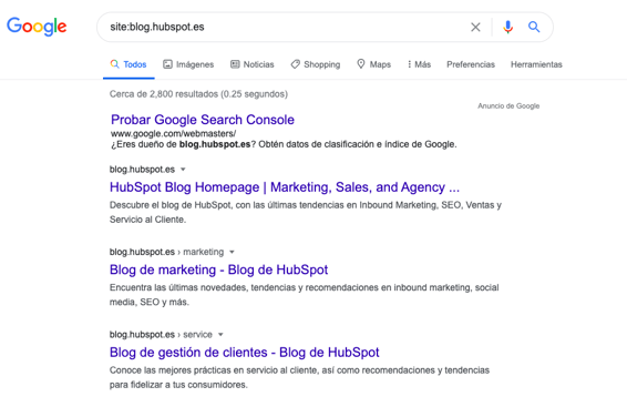 ¿Quieres verificar si tu sitio en particular aparece en Google? Simplemente comienza tu búsqueda con site:nombredelsitio.com (sin espacios). Por ejemplo, esto es lo que que se muestra en Google para HubSpot: