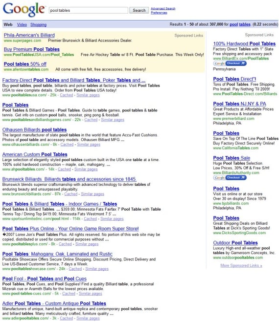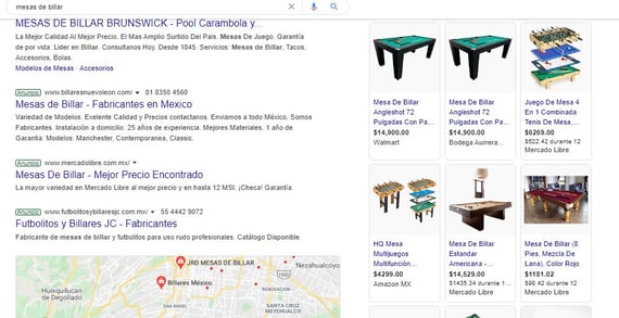 Ahora no solo son más fáciles de leer, sino que las características adicionales brindan una experiencia de búsqueda y compra mucho más informativa e inteligente. Entre el contenido patrocinado y el mapa en vivo (más el carrusel de productos, fragmentos de preguntas y búsquedas relacionadas), Google proporciona casi todo lo que necesitas saber sobre las mesas de billar, en este caso.