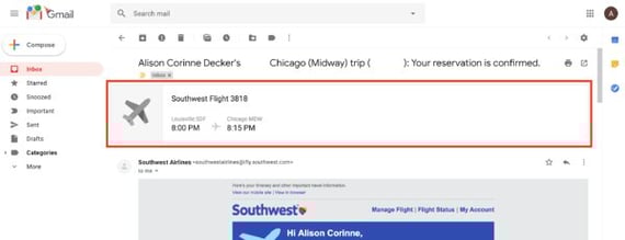 ¿Has reservado un vuelo recientemente o has pedido algo en línea? Si tienes Gmail, es posible que hayas visto los detalles de tu reserva o pedido resumidos en la parte superior del correo electrónico de confirmación. Esto se debe al marcado de correo electrónico.
