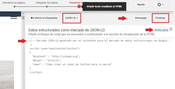 Haz clic en «Descargar» para descargar el script como un archivo HTML. Para obtener más información sobre cómo agregar datos estructurados a tu artículo (o cualquier otro tipo de datos), haz clic en «Artículos», en la esquina derecha arriba del marcado.
