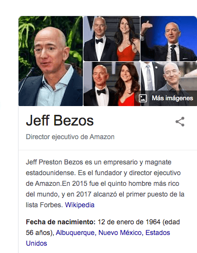 Los paneles de conocimiento reúnen la información más relevante de una búsqueda, y la muestran como un panel separado en el lado derecho de un SERP. Por lo general, incluyen imágenes, fechas e información específica de categoría, como precios de acciones para empresas o cumpleaños de celebridades. Puedes usar un marcado de datos estructurados, como Schema, para etiquetar tu contenido con todas estas categorías, pero no hay garantía de que Google te recompense con tu propio panel de conocimiento.