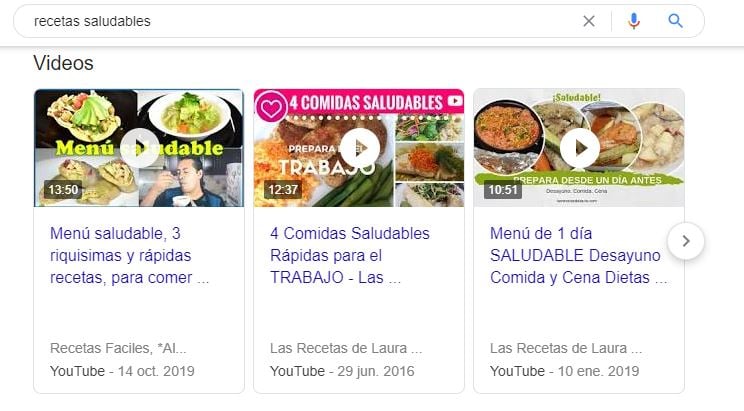 Los videos funcionan de manera similar a los carruseles, pero muestran videos en lugar de imágenes u otros listados. Los usuarios pueden desplazarse por estos resultados para acceder directamente y ver cada video.