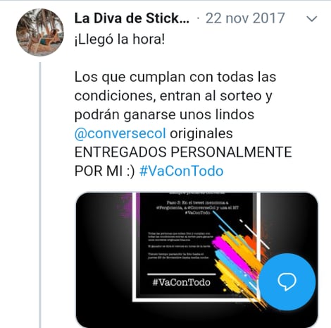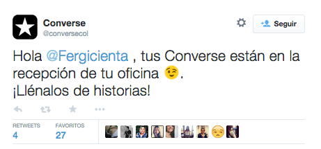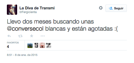 Este es un caso de marketing de influencers espontáneo. Fergicienta, una blogger e influencer colombiana, publicó en Twitter en 2015 que no había podido encontrar unos Converse blancos en más de dos meses.