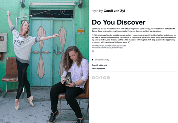 La eficaz campaña «Individuals» de GAP incluye una serie de personalidades influyentes de las redes sociales que muestran cómo portan la ropa de GAP. Los usuarios que ven estas imágenes de los influencers en su sitio web tienen la opción de «comprar el outfit» en los pies de las fotos.