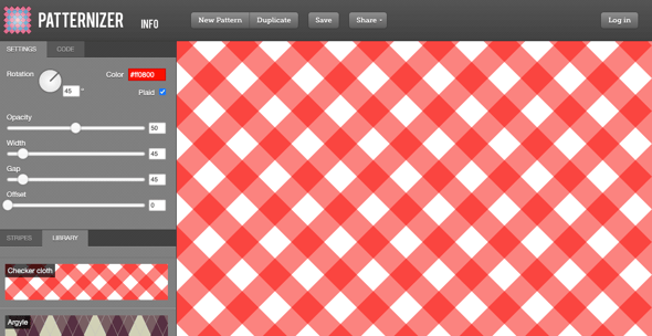 Patternizer es perfecto para ti si tienes mucha creatividad y no quieres usar los fondos que alguien más diseñó. Este sitio te permitirá crear tus propias texturas a base de líneas y colores (algo así como las faldas escocesas). Tal vez te tardes un poco en entender cómo funciona el sitio, pero en cuanto lo comprendas podrás crear cientos de fondos que podrán adecuarse a tu sitio web.