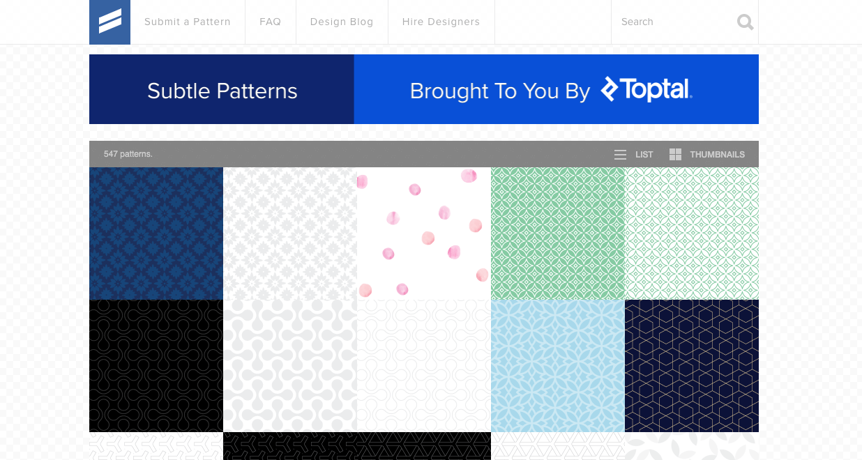 Este es un sitio web para contratar freelancers, pero cuenta con una sección con patrones para usar en fondos de páginas web. Los patrones que ofrecen son totalmente gratuitos, solo debes darles crédito en tu código HTML o CSS. Los fondos que podrás descargar aquí son hermosos, sencillos y personalizables, además de que tienen cientos de ellos. Son perfectos si optas por un fondo sobrio.
