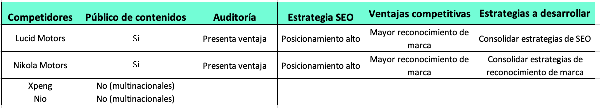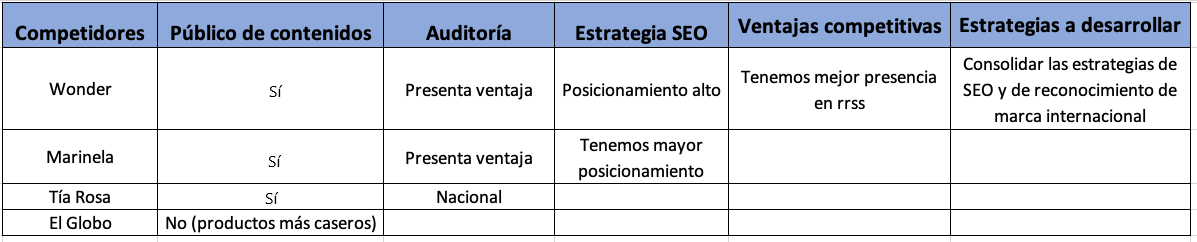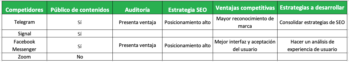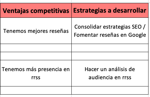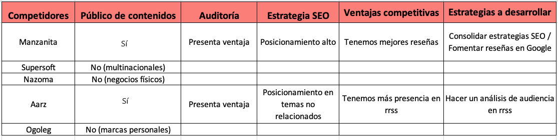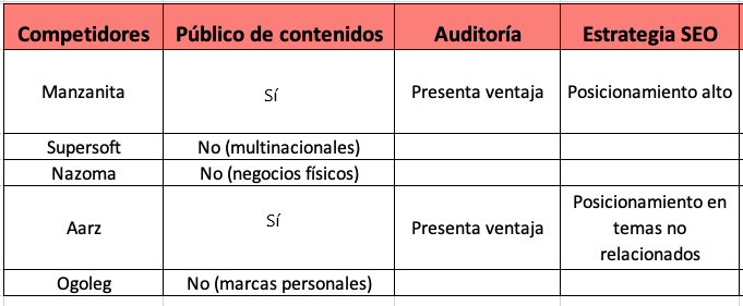 Cuando determines esto, te recomiendo elaborar una tabla para registrar el análisis de tu competencia.