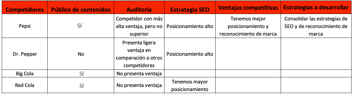En este ejemplo podemos ver a dos competidores importantes de la compañía, que son Pepsi (a nivel global) y Big Cola (en Estados Unidos y América Latina). En el caso de Big Cola, la principal diferencia es el precio; mientras que con Pepsi hay ligeras divergencias en las estrategias de marketing.