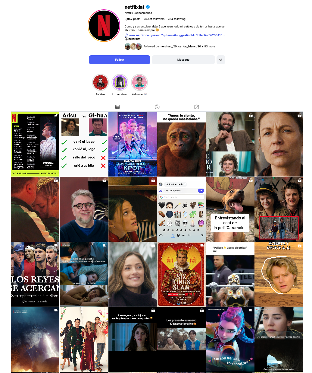 Citamos mucho a Netflix Latinoamérica cuando se trata de dar un ejemplo de una marca que hace buen trabajo con su audiencia. Uno de sus grandes aciertos es la variedad de contenido, porque no se limita únicamente a anunciar su programación, sino que juega con la popularidad de sus producciones para crear publicaciones relacionadas, como: