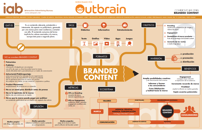 Con este concepto visual puedes representar una idea principal o tema (en el centro del mapa) y sus ramificaciones. Mira este ejemplo del IAB: