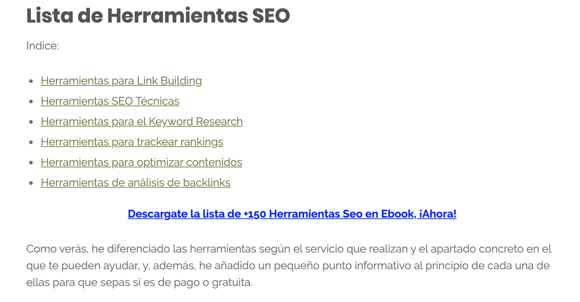 Rafa Sospedra utilizó esta estrategia en su publicación de más de 140 herramientas SEO. En ella ofrece una descarga gratuita que detalla todas las herramientas presentadas en su publicación; es el recurso perfecto para que un lector la guarde y consulte cuando lo necesite.