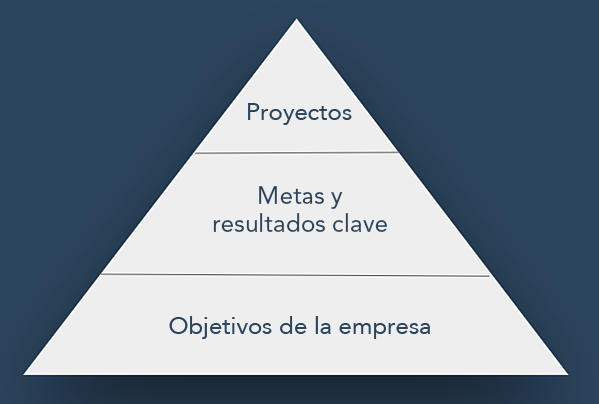 Para implementar OKR en una empresa se establece un objetivo principal y de este se desprenden 3 resultados clave que se deben conseguir. Cada uno de sus resultados clave contienen KPIs para medir acciones necesarias orientadas a lograr ese resultado clave.