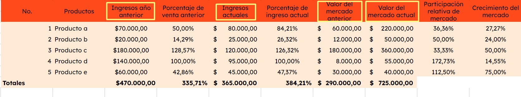 Luego, incluye celdas para los Ingresos año anterior; Porcentaje de venta año anterior; Ingresos actuales; Porcentaje de ingreso actual; Valor del mercado anterior; Valor del mercado actual; Participación relativa en el mercado y Crecimiento del mercado.