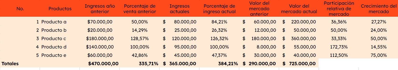 Con la plantilla Matriz BCG, podrás realizar muchas de estas operaciones de manera automática. Tan solo debes introducir los valores y cantidades de tus productos y el valor del mercado y podrás clasificarlos de acuerdo con los criterios BCG en cuestión de segundos.