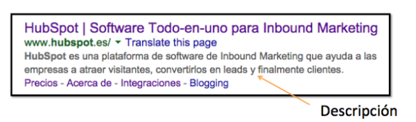 Las descripciones también se muestran en los resultados de búsqueda y pueden ayudar a aumentar los CTR, pero recuerda que hoy día no tienen un impacto directo en la clasificación. Su propósito es indicarle a las personas que realizan la búsqueda por qué deben hacer clic en tu resultado. Utiliza una de tus palabras clave o frases en tu meta descripción que sea relevante para la consulta, pero que también sea atractiva para el usuario. Esto es excelente para vender los beneficios de hacer clic en los contenidos de esa página.