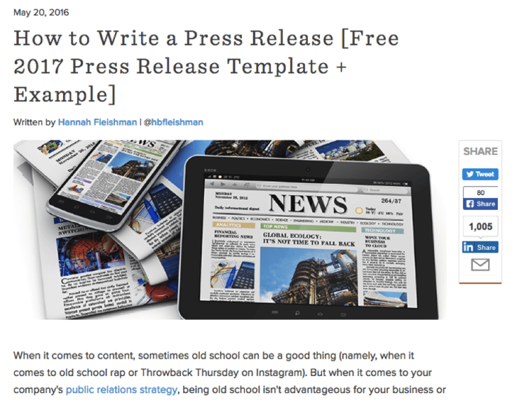 Hace unos años, llevamos a cabo una auditoría de los artículos del blog de HubSpot que generaban la mayor cantidad de tráfico orgánico para ver si nuestras ofertas estaban realmente optimizadas para la conversión. Descubrimos que podíamos alinear aun más los temas de los artículos del blog y los temas de las ofertas en algunas áreas y, tras realizar algunos cambios, observamos un aumento en la tasa de conversión. Por ejemplo, las conversiones que genera la siguiente publicación se incrementaron de manera significativa cuando cambiamos una oferta de marketing genérica por una plantilla de notas de prensa.