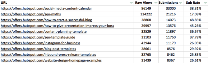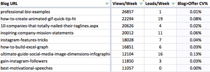 A continuación, ordené los datos en función del mayor número de visualizaciones de las publicaciones del blog y el mayor número de oportunidades de venta generadas, y comencé a comparar estos datos con las tasas de conversión correspondientes a las páginas de destino de las ofertas. Esto me ayudó a priorizar mis esfuerzos de optimización y logré descifrar qué artículos tenían el mayor potencial para producir cambios reales. Una oferta con una tasa de envío del 70% y 800 visualizaciones al mes no representaba una oportunidad tan buena a la hora de incrementar las oportunidades de venta sin procesar como una oferta con una tasa de envío del 45% y 15.000 visualizaciones mensuales.