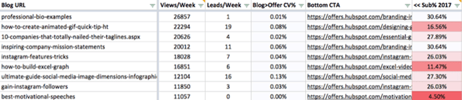 Lo siguiente fue aplicar la fórmula mágica BUSCARV para asociar las tasas de envío correspondientes a las páginas de destino de las ofertas con aquellas publicaciones del blog enlazadas a dichas ofertas. Rápidamente se volvió evidente que algunas de nuestras mejores publicaciones conducían a ofertas con un desempeño terrible. Entre los artículos con menor rendimiento también logré detectar algunas tendencias relacionadas con los temas, tales como redes sociales, desarrollo profesional y creación de contenido.