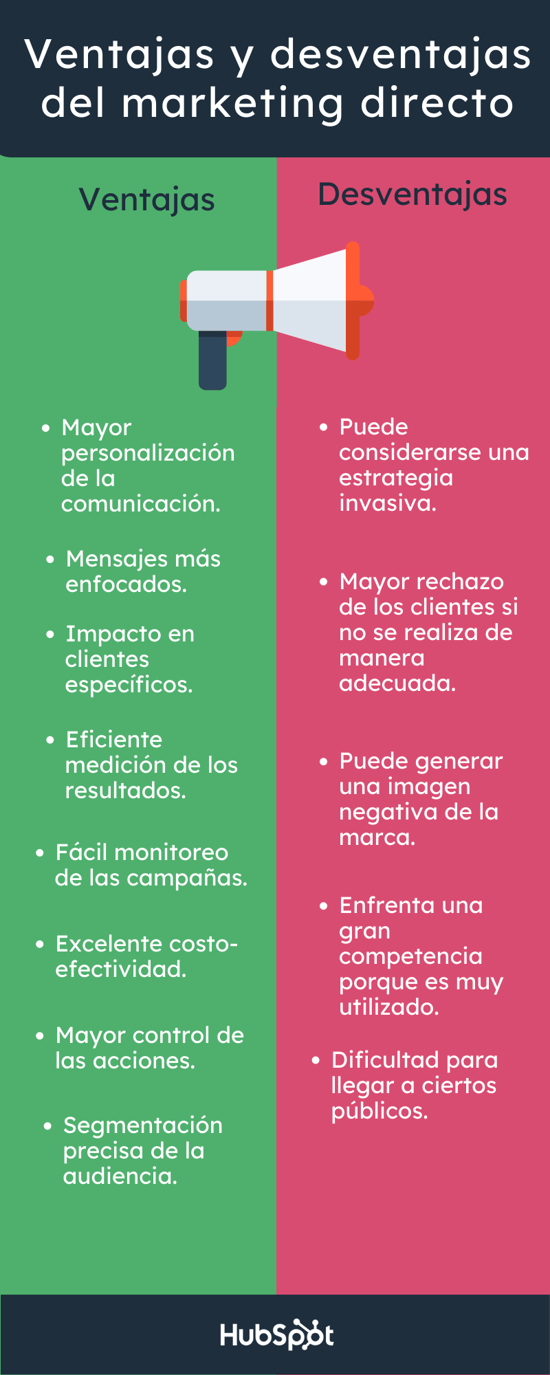 El marketing directo presenta diferentes ventajas y desventajas, que dependen de la industria o mercado, la relación de una marca con sus prospectos y clientes, así como la oferta comercial de la empresa.