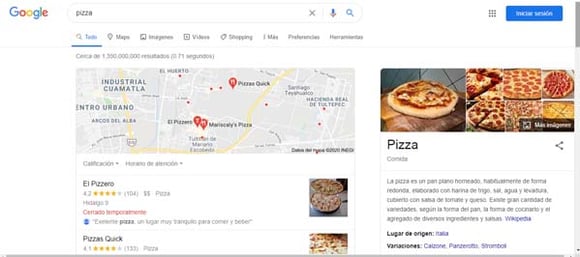 Los motores de búsqueda son cada vez más inteligentes. Hace unos años, una búsqueda de «pizza» daría como resultado una mezcla predecible de sitios web de restaurantes, directorios, sitios de reseñas y publicaciones de blogs sobre las principales pizzerías.