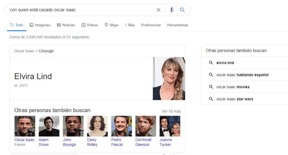 Cuando es probable que tu búsqueda solo tenga una respuesta (por ejemplo: «el clima de hoy» o «con quién está casado Oscar Isaac»), Google mostrará un gráfico de conocimiento, es decir, un cuadro que extrae la respuesta directamente de un resultado y lo hace visible en la parte superior de la página.