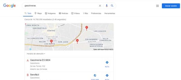 Estos aparecen cada vez que una intención de búsqueda se relaciona implícitamente con la ubicación. Por ejemplo, si escribes «restaurantes», «estación de gasolina» o el nombre de un producto específico que se vende en las tiendas, Google mostrará las ubicaciones cercanas que coincidan con tu consulta y mostrará en un mapa exactamente dónde puedes encontrarlas.