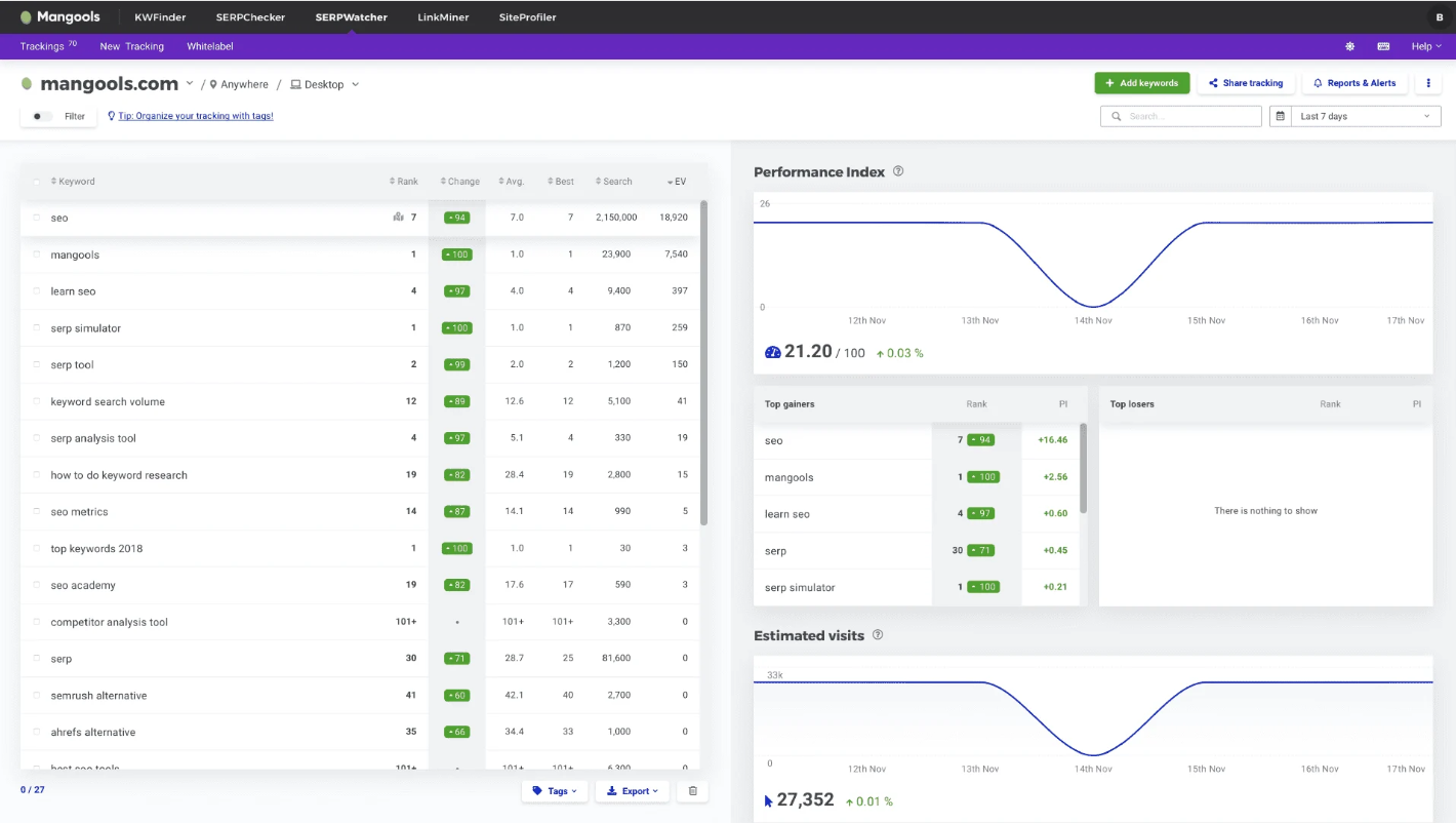 SERPWatcher es un panel de control todo en uno, muy intuitivo en su operación, ya que ofrece una descripción general del rendimiento de tu SERP. Aún mejor: puede crear una lista de palabras clave personalizadas y realizar un seguimiento de los datos. SERPWatcher envía fácilmente un correo electrónico cada vez que sus palabras clave entran o salen de la página uno de los motores de búsqueda.