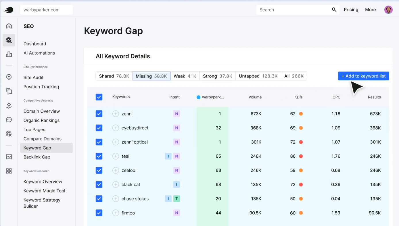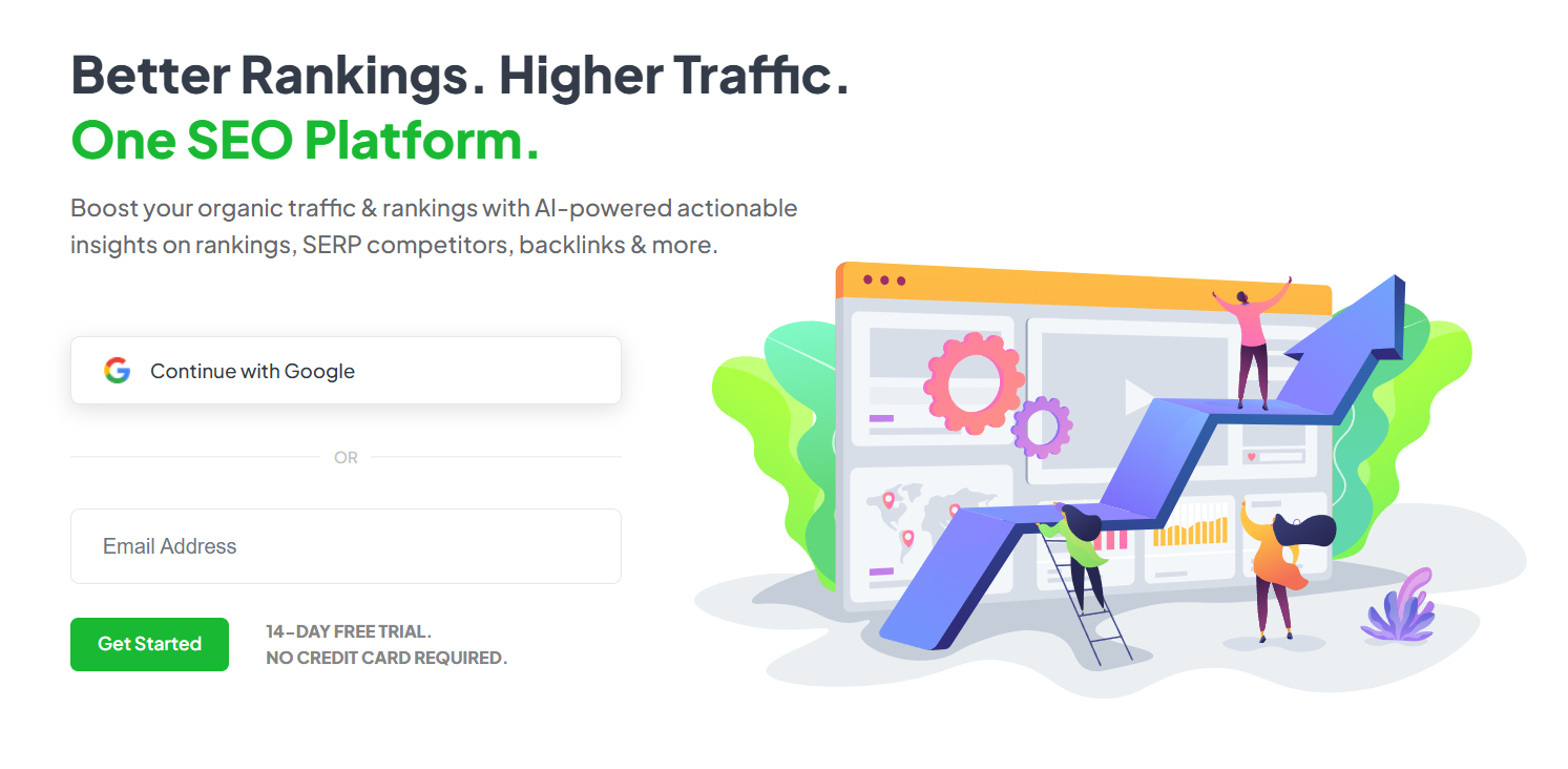 Ahora que tienes una idea de las diferentes funciones SERP, probablemente te estés preguntando cómo se puede clasificar más alto en SERP y cómo puedes ganar un espacio, por ejemplo en los resultados universales. Estas son algunas de nuestras herramientas favoritas para ayudarte a evaluar tu posición actual en SERP, comparar la clasificación de palabras clave con la competencia y, en última instancia, descubrir cómo obtener una clasificación más alta: