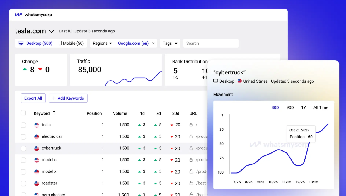 WhatsMySerp proporciona herramientas avanzadas de SEO para escanear y analizar tu clasificación para diferentes palabras clave, así como la clasificación general de tu sitio web en SERP. Esta herramienta permite buscar hasta 25 palabras clave a la vez, lo que la hace ideal para obtener una descripción general rápida de cómo se clasifica tu sitio en los motores de búsqueda.