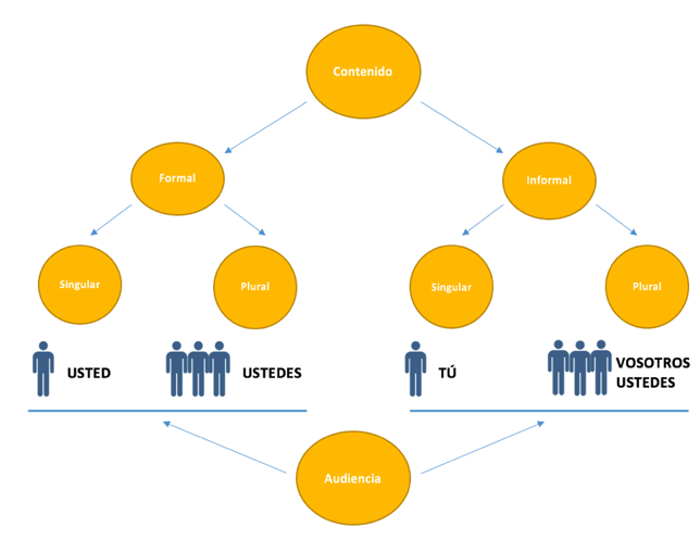 Lo que en idiomas como el inglés no supone ningún problema (el uso del pronombre you se adapta a todos los contextos) representa una situación bastante compleja en español. Para ilustrarla mejor, he creado el siguiente gráfico: