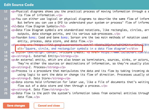 Tu texto alternativo se escribe automáticamente en el código HTML de la página web, donde puedes editar aún más el texto alternativo si tu CMS no tiene una ventana de edición fácil. Así es como se vería esa etiqueta alt en el código fuente de un artículo:
