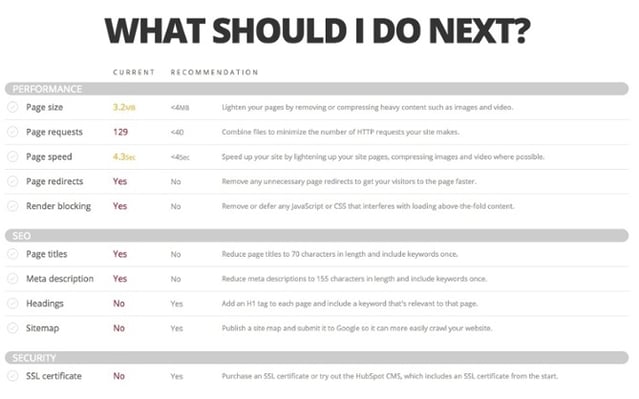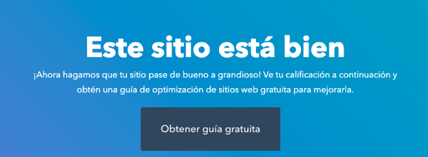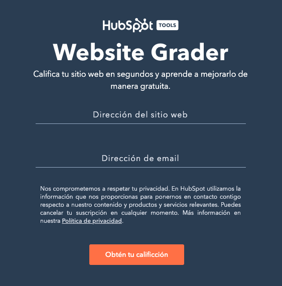 Es tan sencillo como proporcionar la URL del sitio web que quieres analizar y tu correo electrónico. Website Grader te dará un resultado del 1 al 100 y recibirás un informe sobre el rendimiento de tu web en cada una de las áreas.