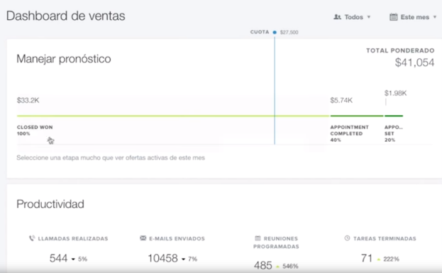 Por ejemplo, los gerentes pueden ver cuántos contactos ha hecho cada vendedor, el porcentaje de conversión de cada etapa del embudo y cuántas oportunidades están avanzando hacia el cierre.