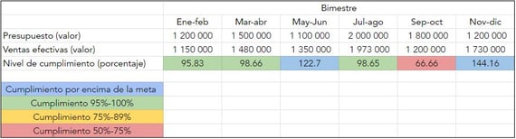 Un presupuesto de ventas también puede ayudarte a crear un plan operativo para elaborar estrategias rentables y tener la oportunidad de planificar los meses con menores ingresos. En este ejemplo, justamente, puede verse la ligera baja que existe en el último mes.
