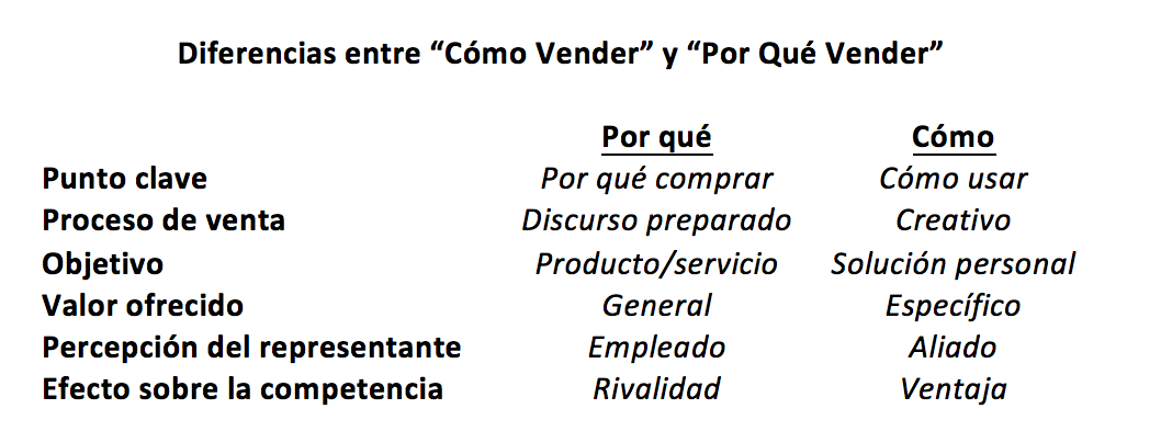 A tus prospectos les interesan mucho más sus objetivos y metas comerciales que el hecho de que tu empresa sea familiar. Es útil contar con una manera rápida de describir tu empresa y lo que representa, así como también tu enfoque comercial, pero no es el aspecto más importante que le debes comunicar al prospecto. A continuación, presentamos una comparación entre dos tácticas de ventas diferentes: «por qué» vs. «cómo». Claramente, uno de los dos métodos funciona mejor que el otro.