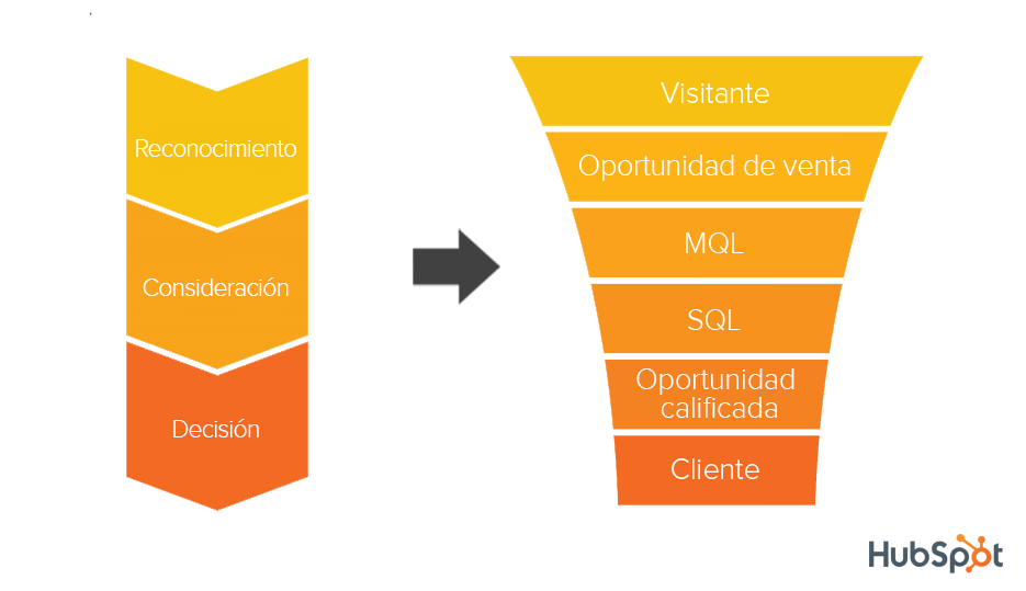 En el embudo, como parte del recorrido del comprador, los clientes atraviesan estas etapas: