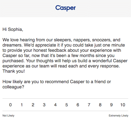 Por ejemplo, esta es la encuesta que envía Casper a sus clientes por correo electrónico tras comprar uno de sus productos: