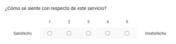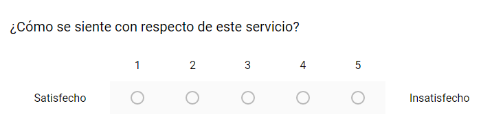 Si buscas una alternativa para tu escala de Likert en español, te recomendamos que uses las plantillas prediseñadas de Google Forms. En ellas encontrarás distintas posibilidades para tus enunciados y respuestas; lo único que necesitas para crearlas es una cuenta de correo electrónico. Escoge la opción de escala lineal para obtener un formato como el siguiente: