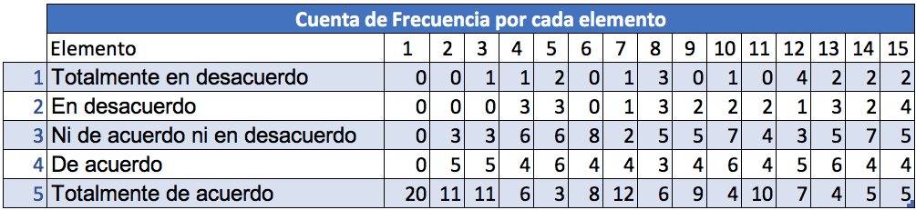 Como puedes ver, esta escala de Likert en Excel es un cuestionario realizado a 20 clientes que consta de 15 enunciados con 5 opciones de respuesta. Si alguno de los sujetos no respondió al enunciado formulado, se deja ese valor en blanco para igualarlo a 0.